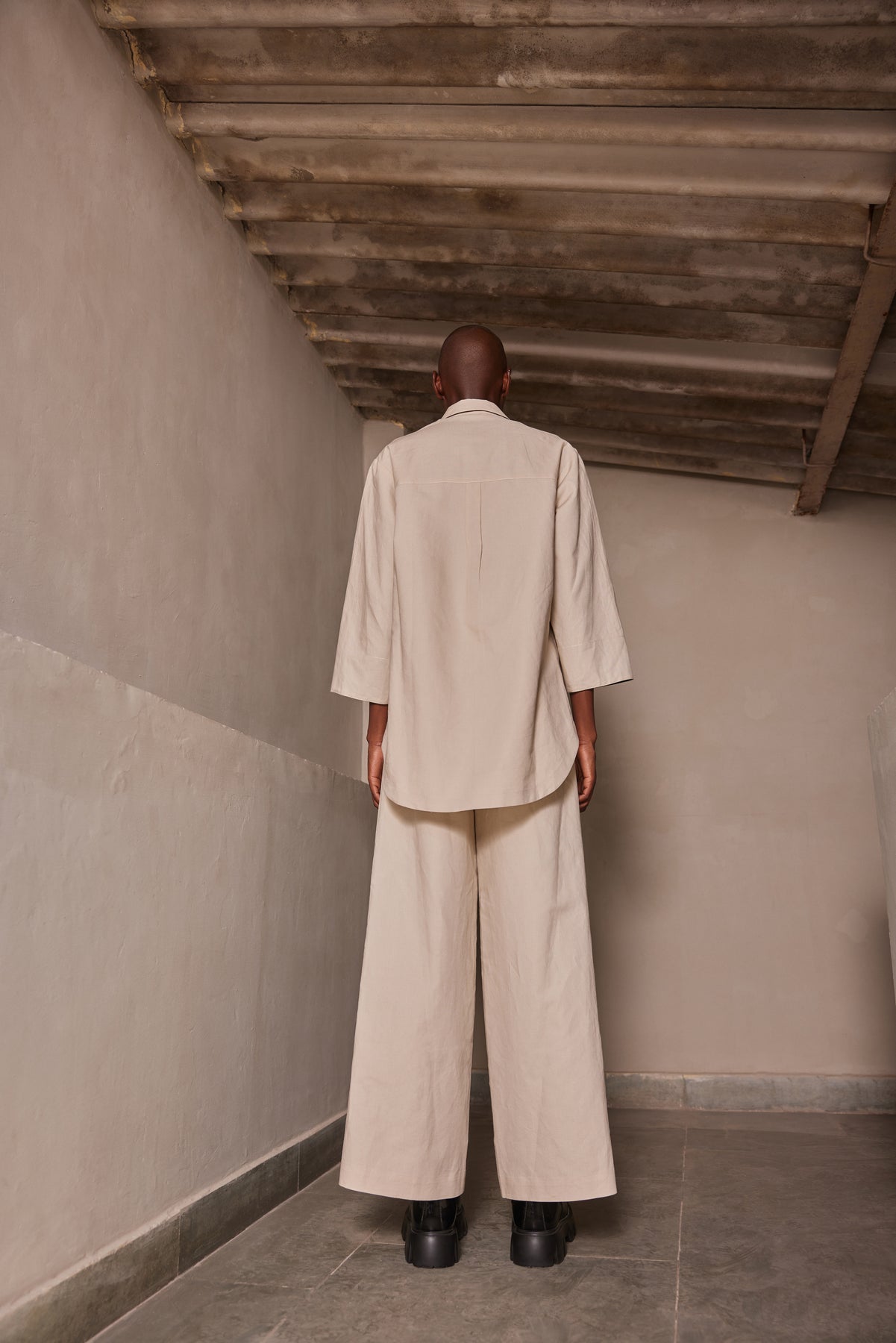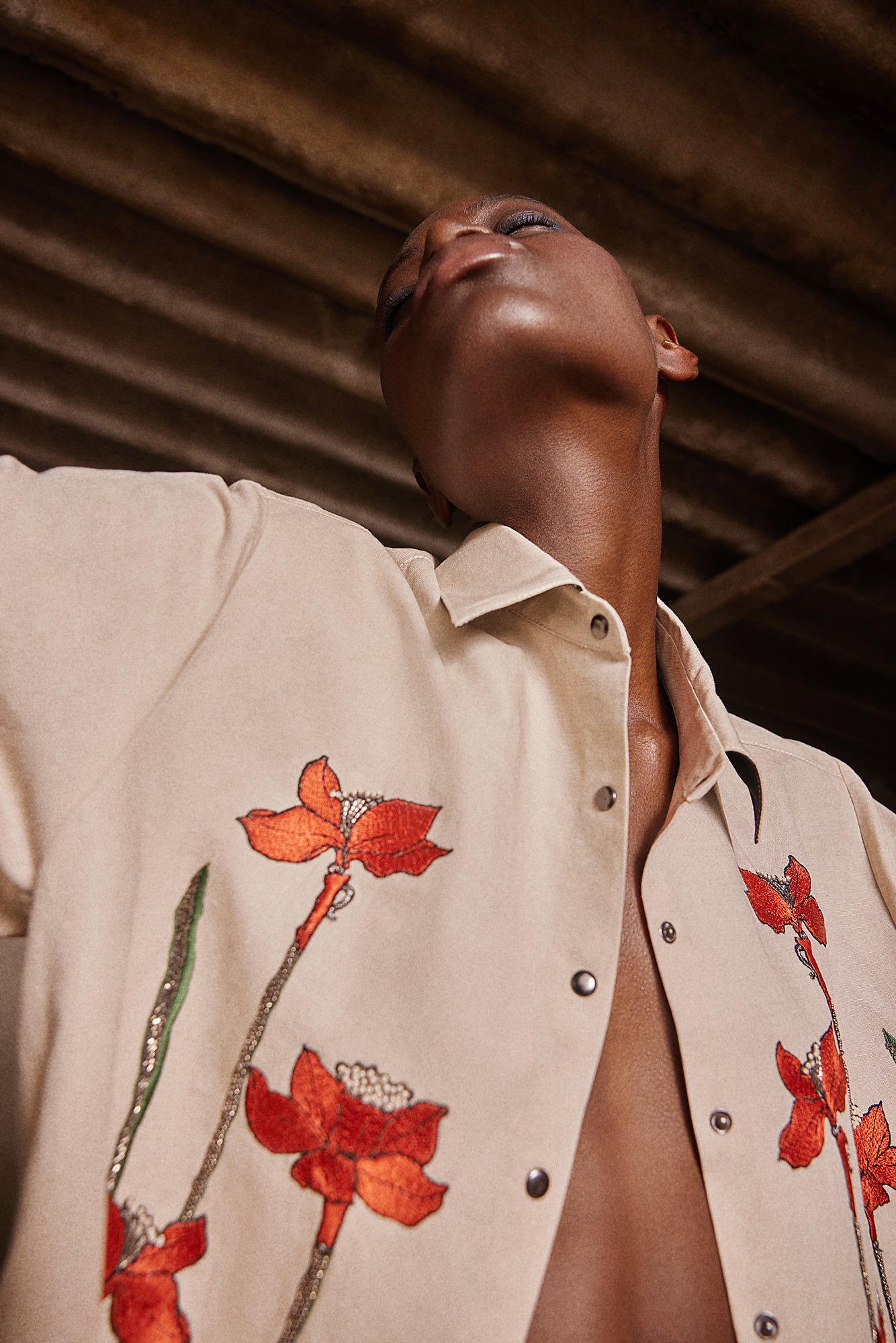 A baggy shirt with intricate hand-embroidered Narcissus Garden. It features metal snap buttons and top-stitching detail. Paired with matching straight pants.