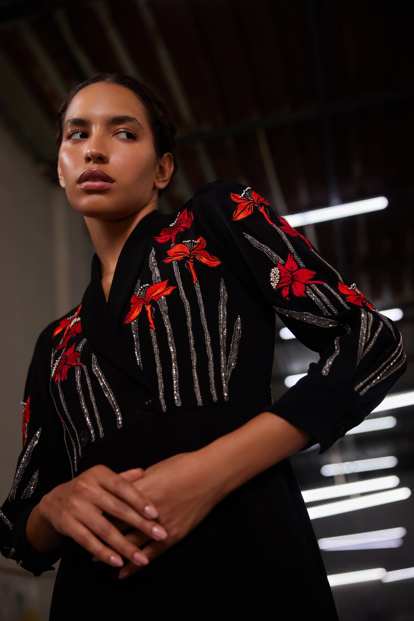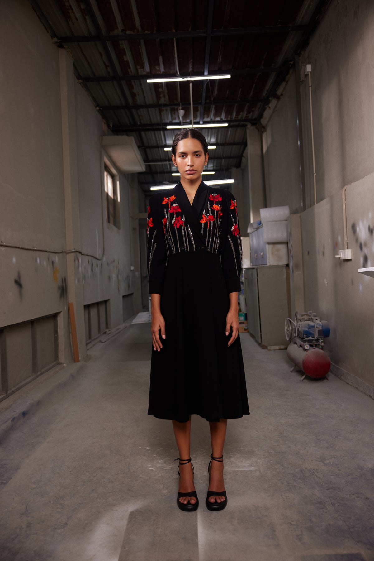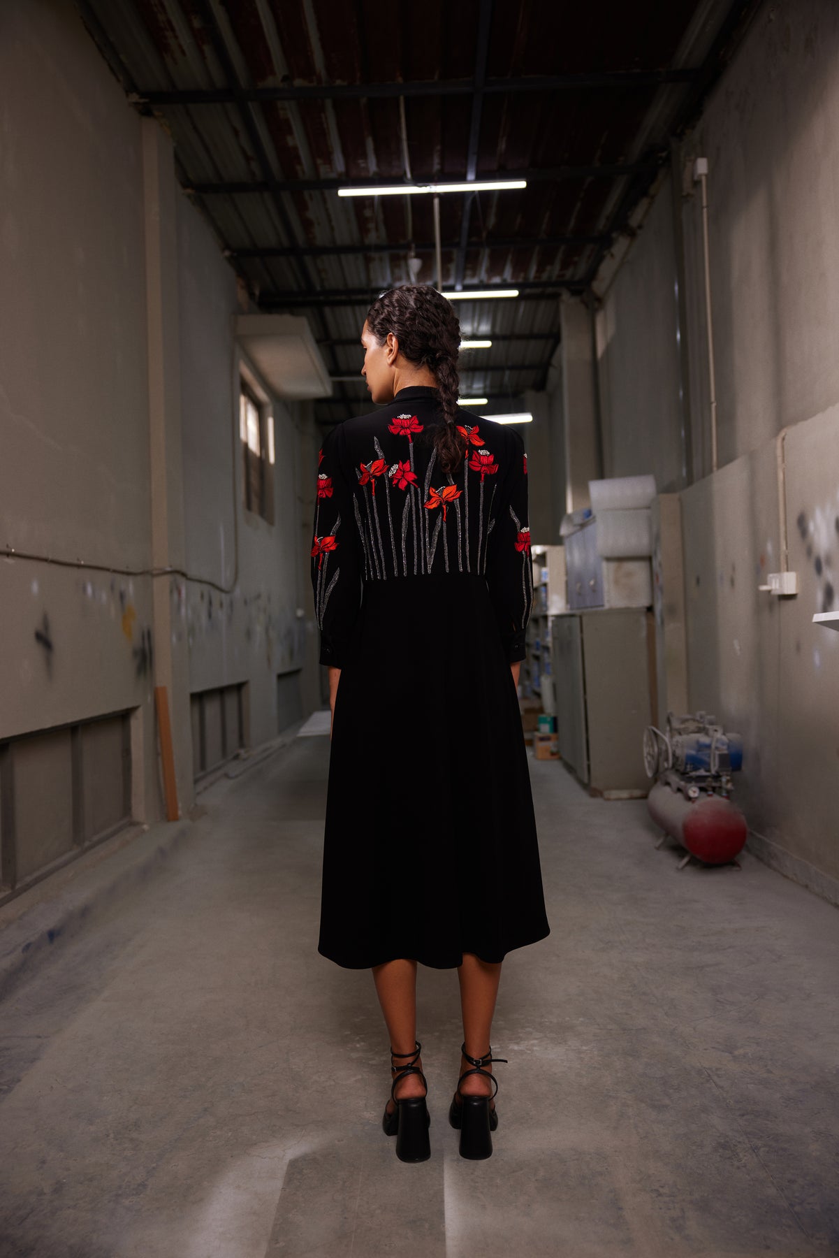 Wrap long dress with Narcissus garden embroidery. It has fabric-covered buttons and cuffs.