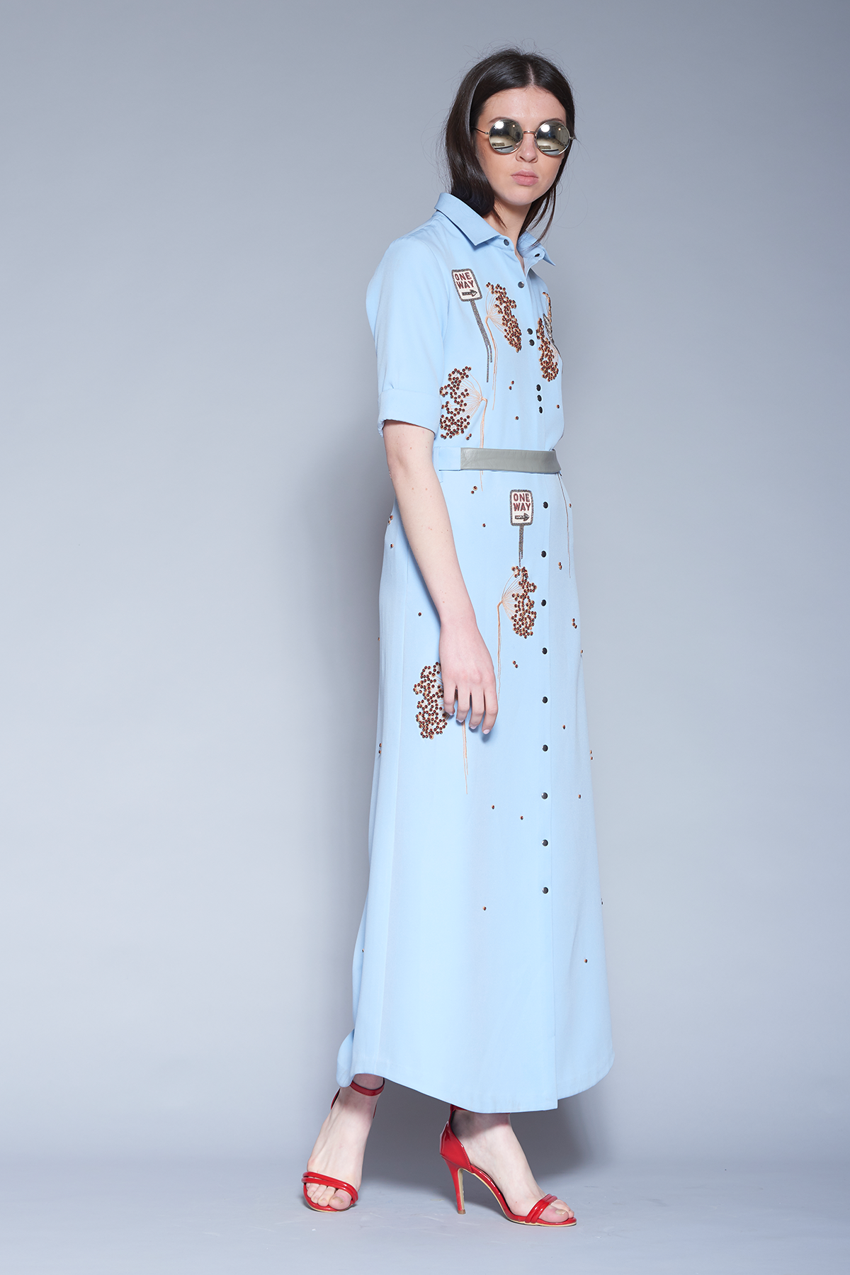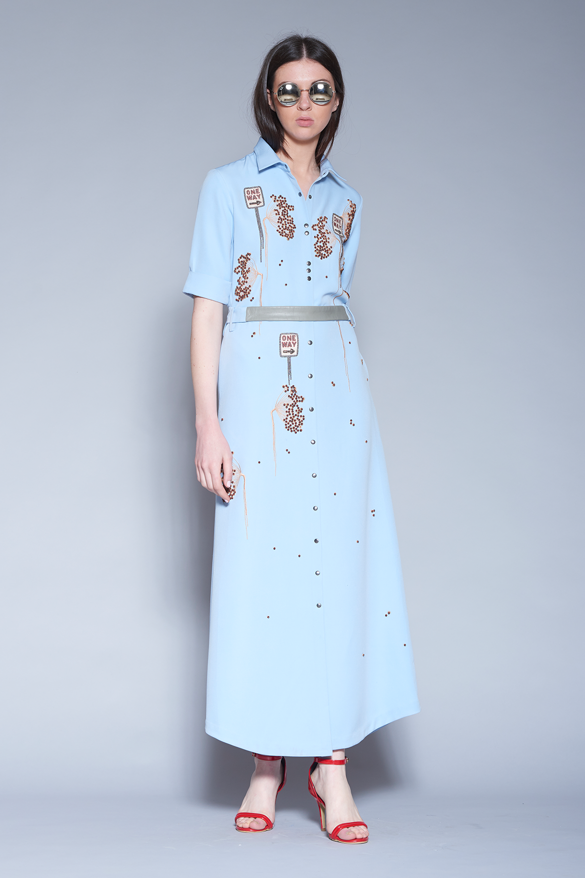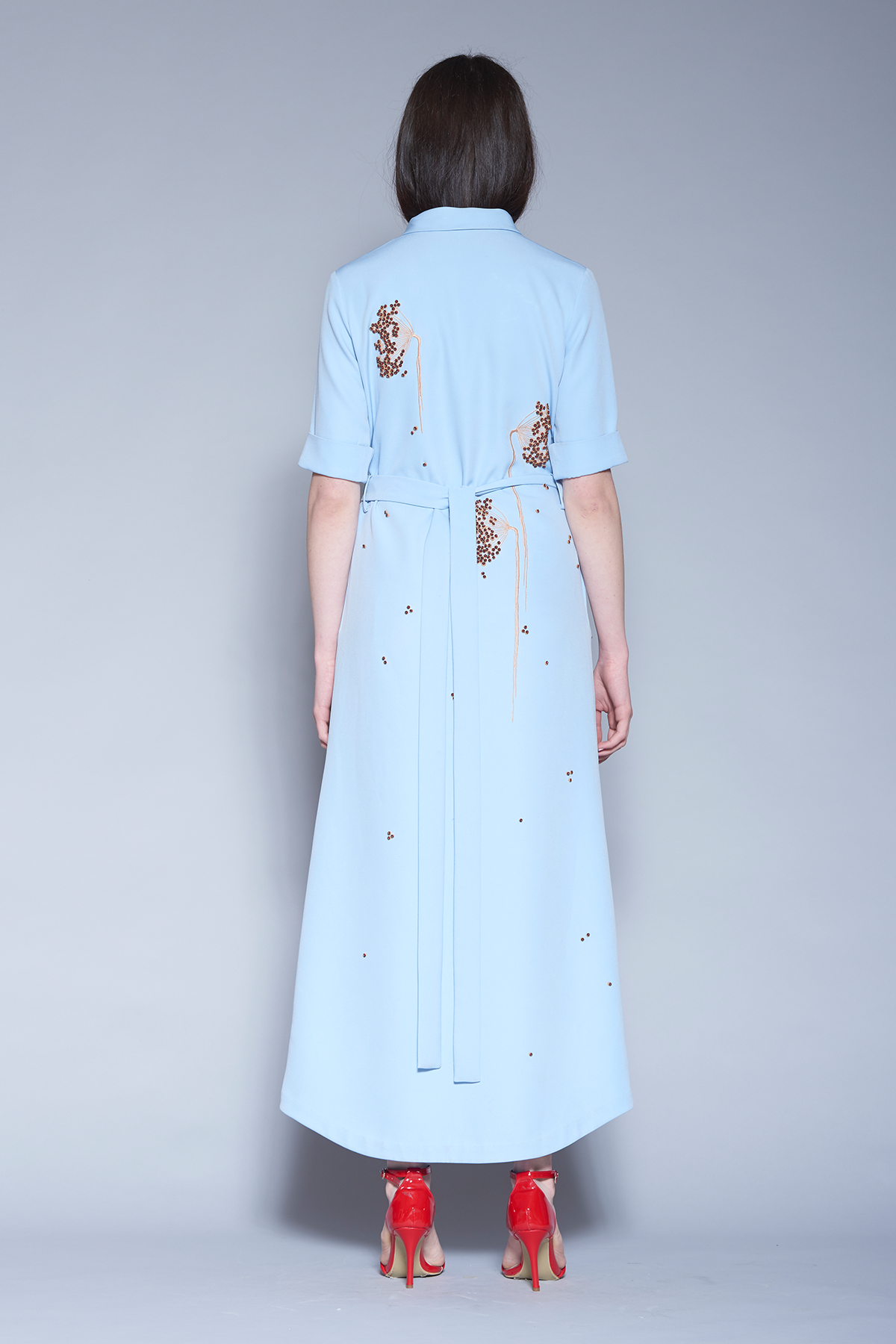 Sleeveless midi dress with hand-embroidered wildflowers and dragonflies. The garment has front gathers, concealed zip at the back, lining, and side pockets.