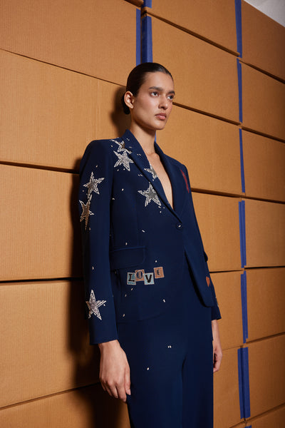 Pants with stars embroidery with a side concealed zip opening and pockts.