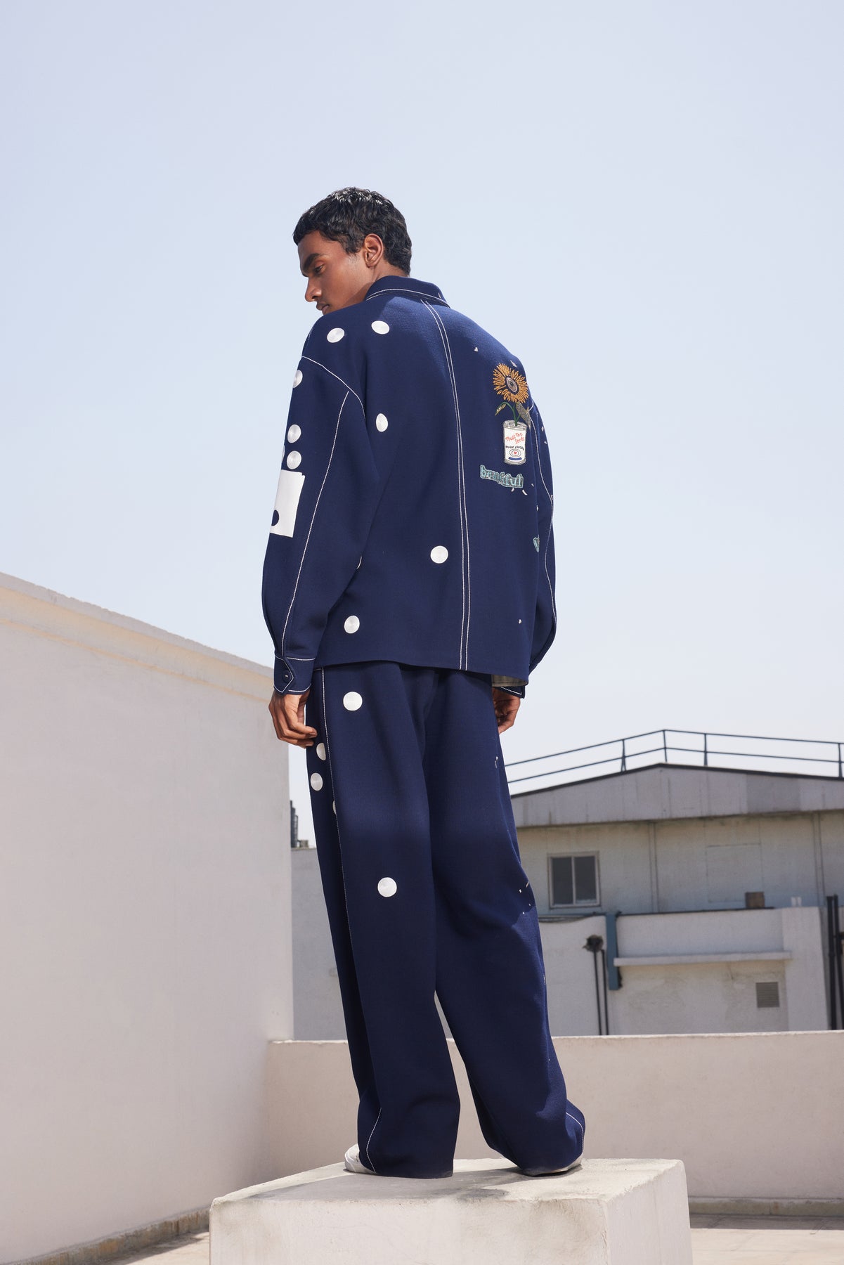 Baggy pants with embroidery. It has front zip opening, fabric covered button, top stitching detail and front cross pockets.