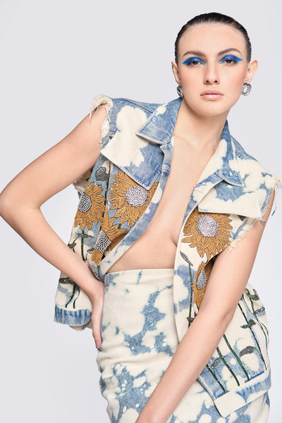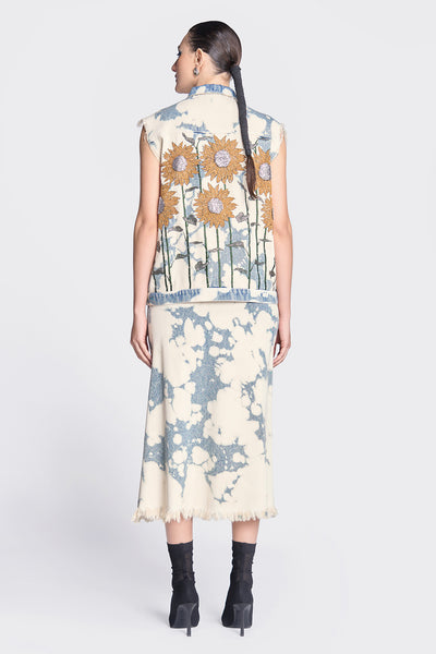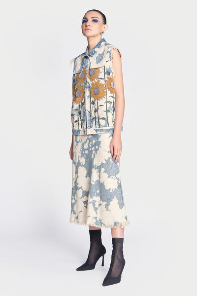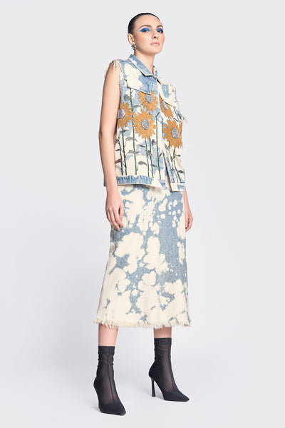 Denim Pencil Skirt With Raw Edged Hemline. It Has a Side Concealed Zip Opening.