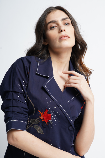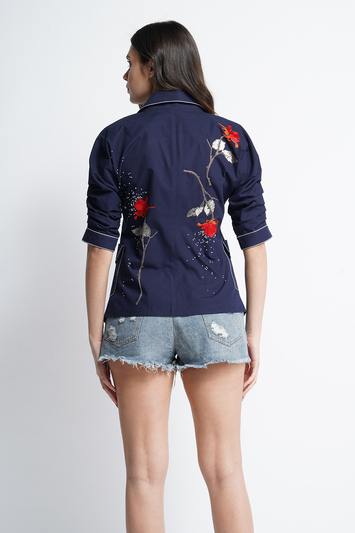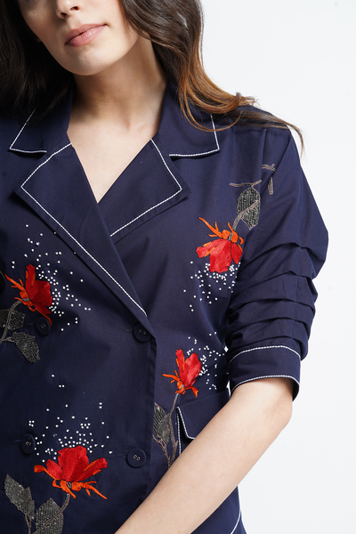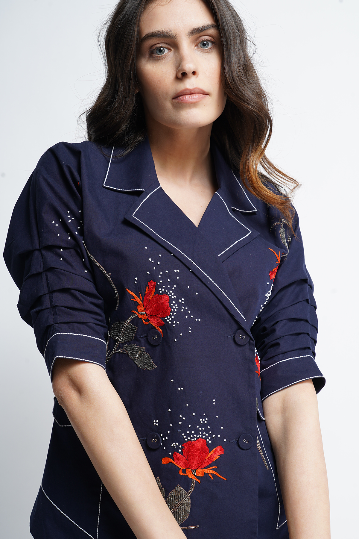 Waistcoat jacket with rose hand embroiedry. The garment has pocket, lapel, gathers on sleeves and fabric covered buttons.