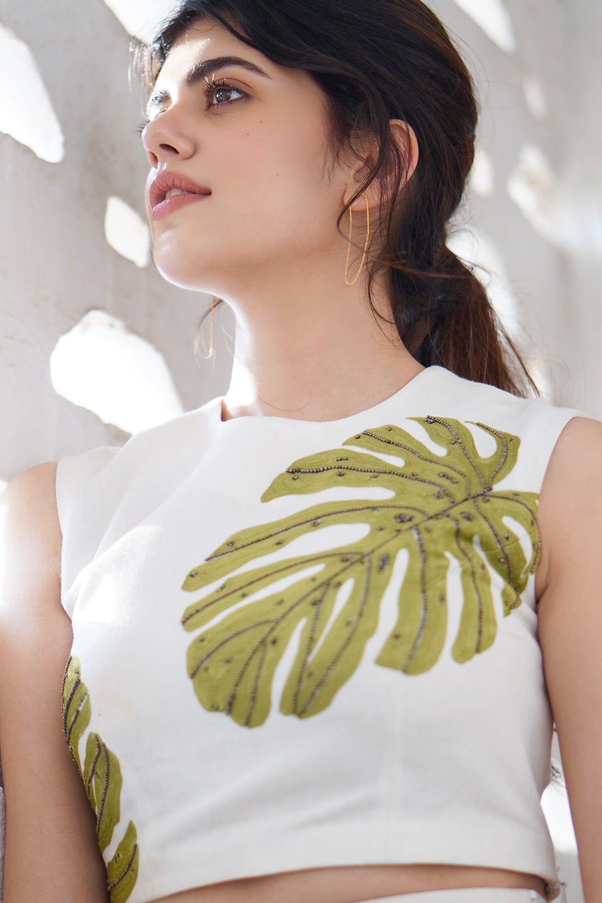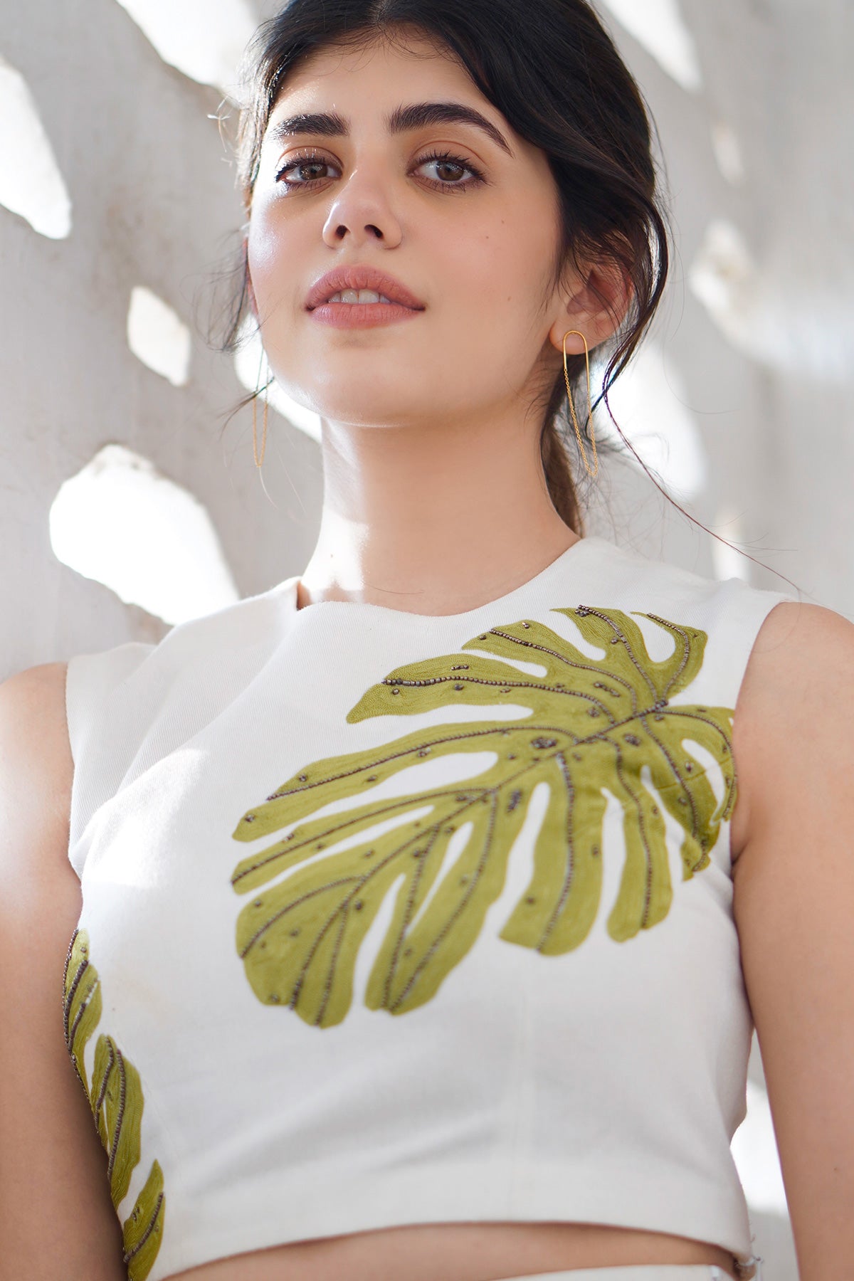 Crop Top & Skirt Embroidered With Cool Monstera Colorful Leaves. Crop Top Has Concealed Zip at Back and Side. Skirt Has Pockets and Snap Buttons Fastening.
