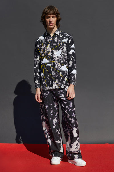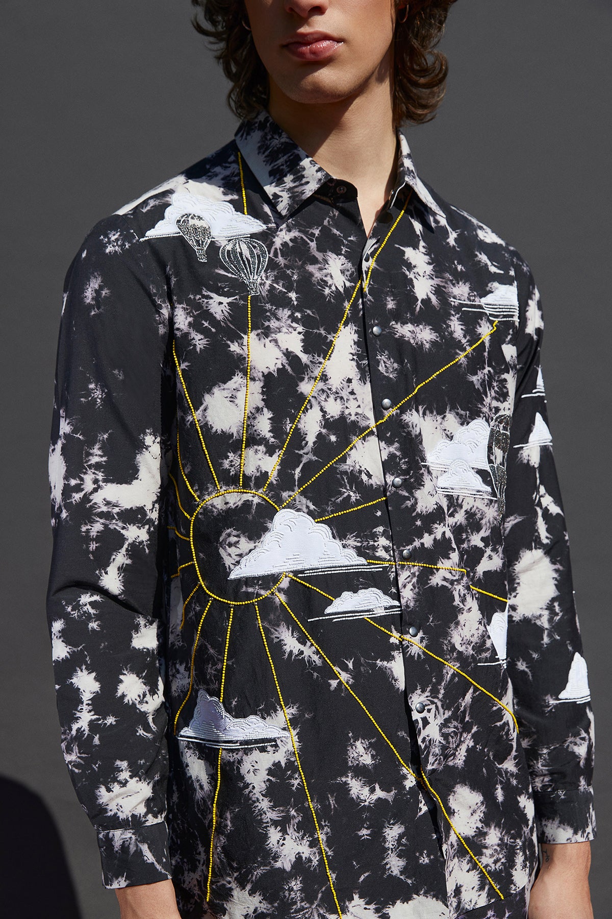 Full sleeves shirt with Sun, air balloons and clouds embroidery. It has metal snap buttons.