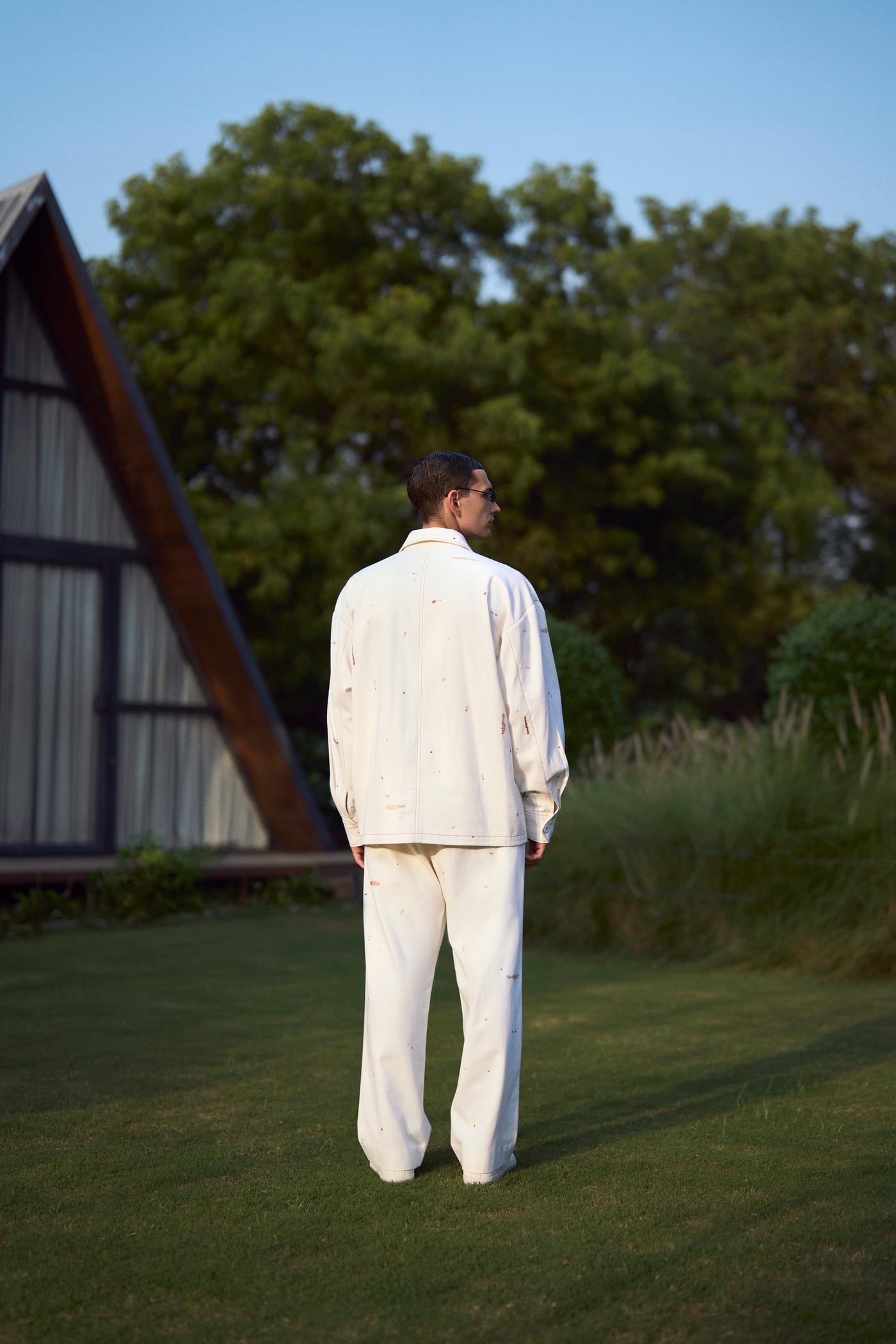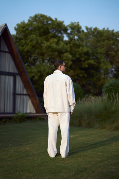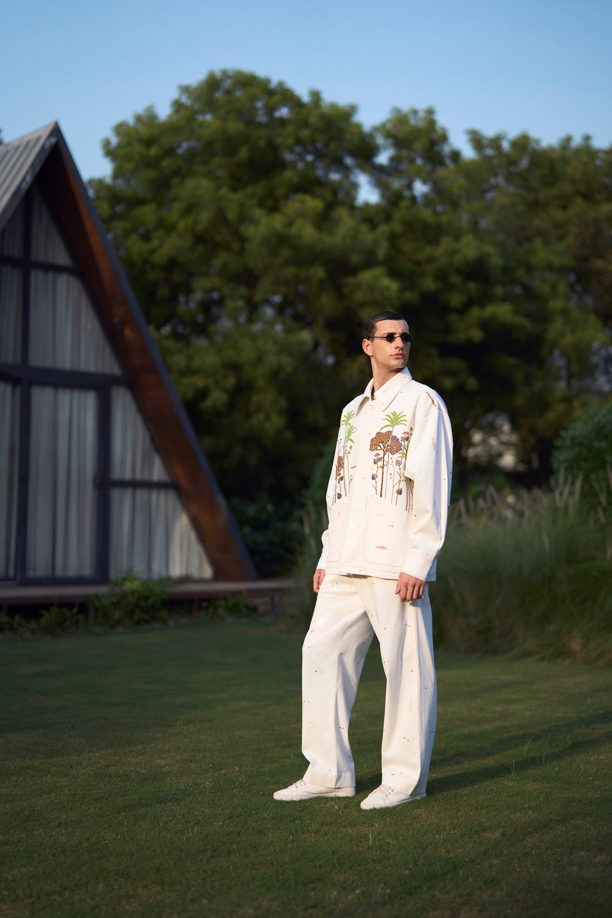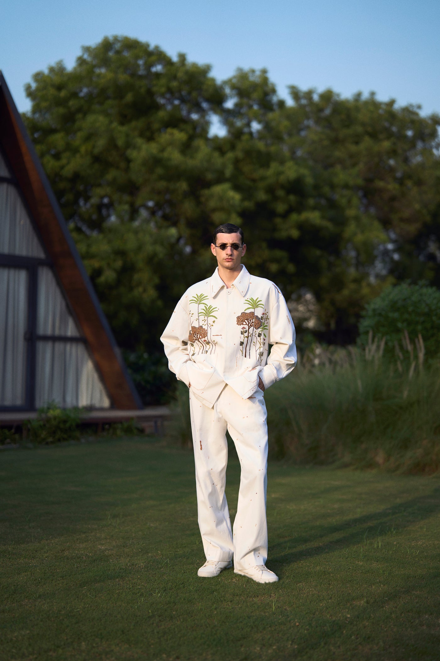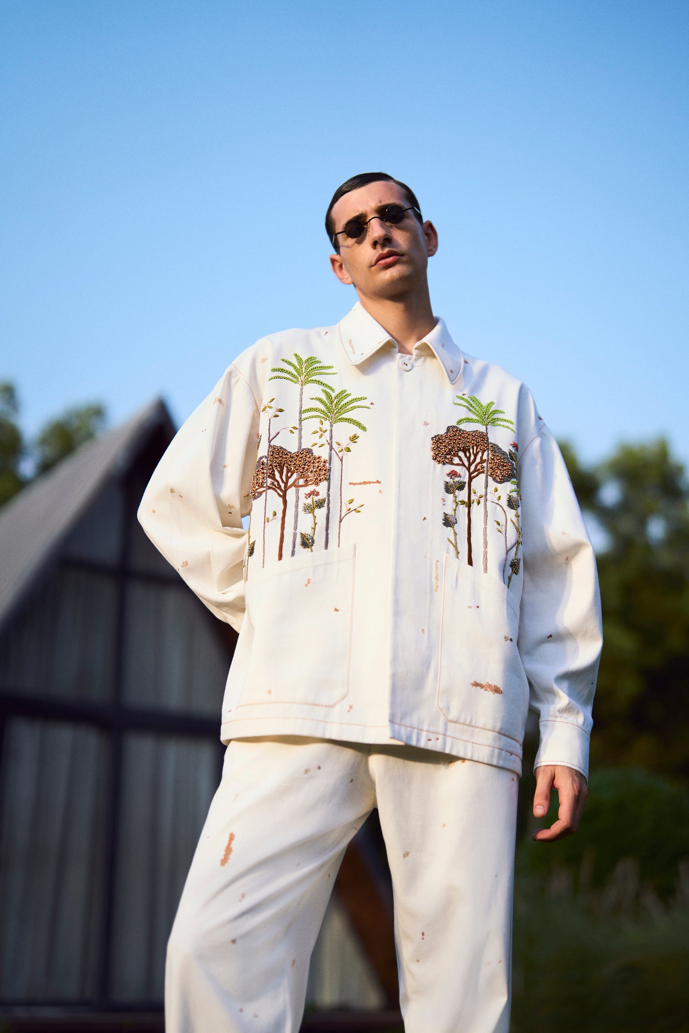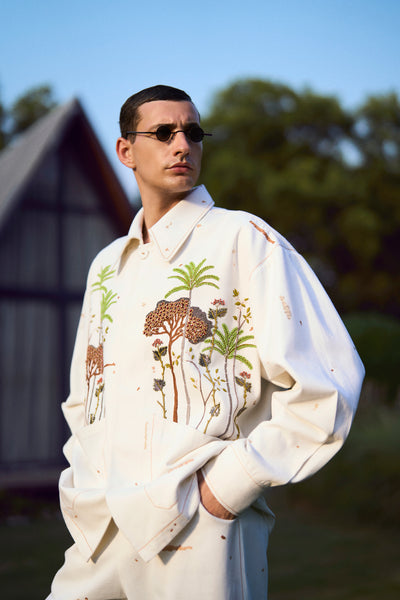 Oversized Jacket with intricate hand-embroidered tropical forest trees. It has collar, fabric covered buttons and top stitching detail. It also has folder piping inside.