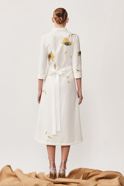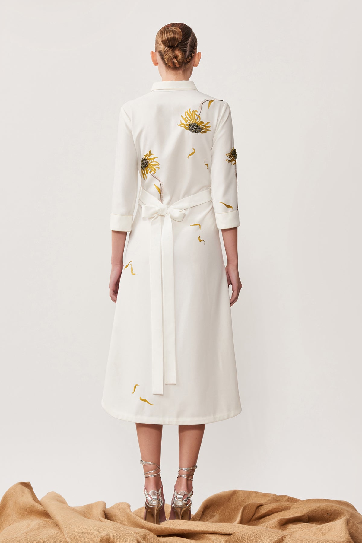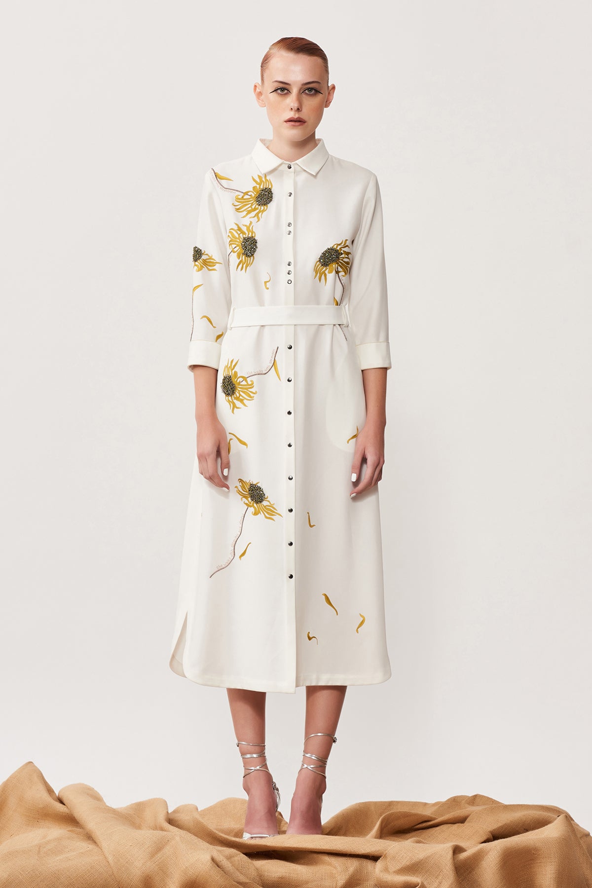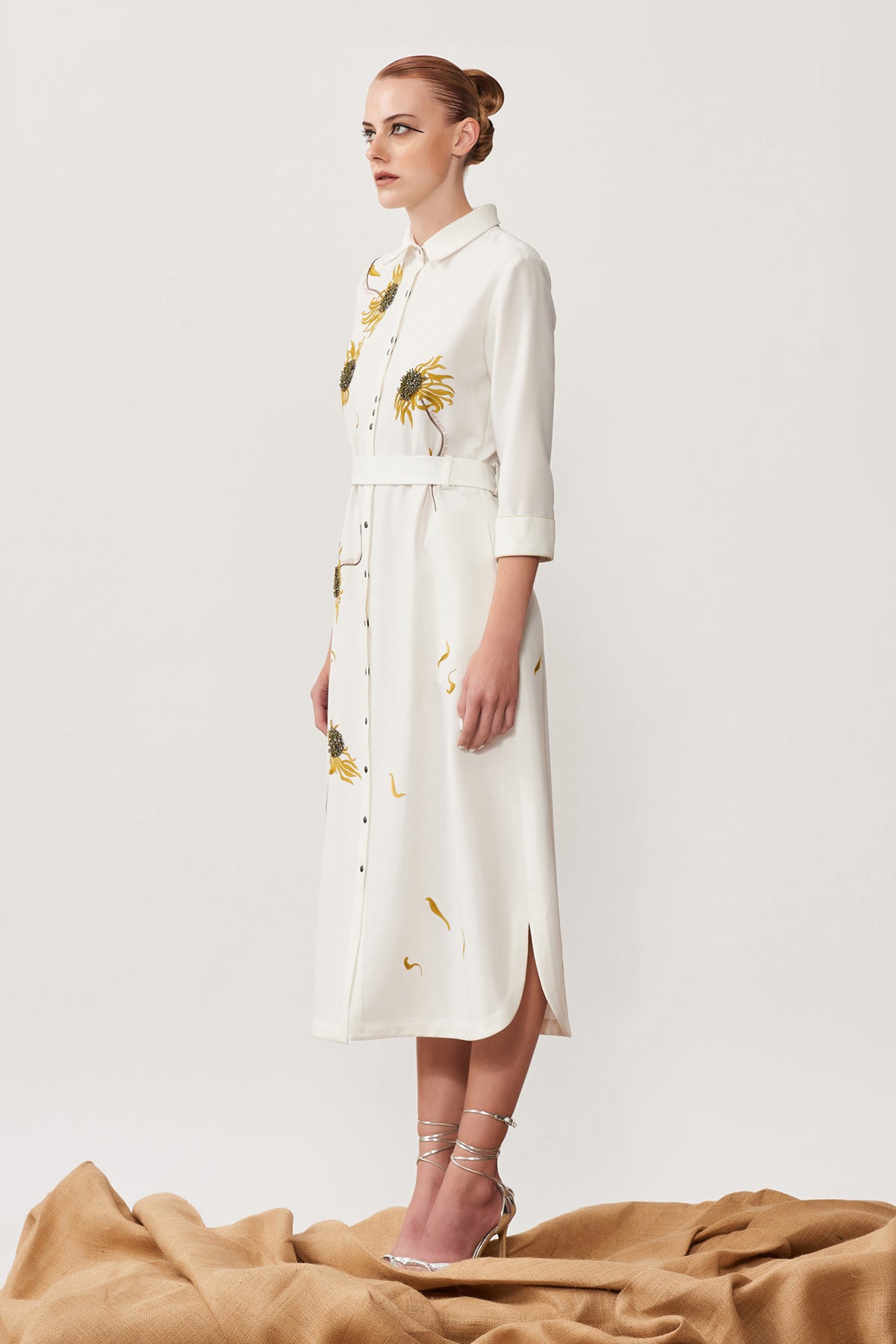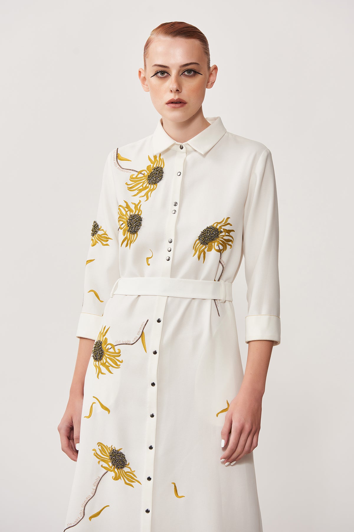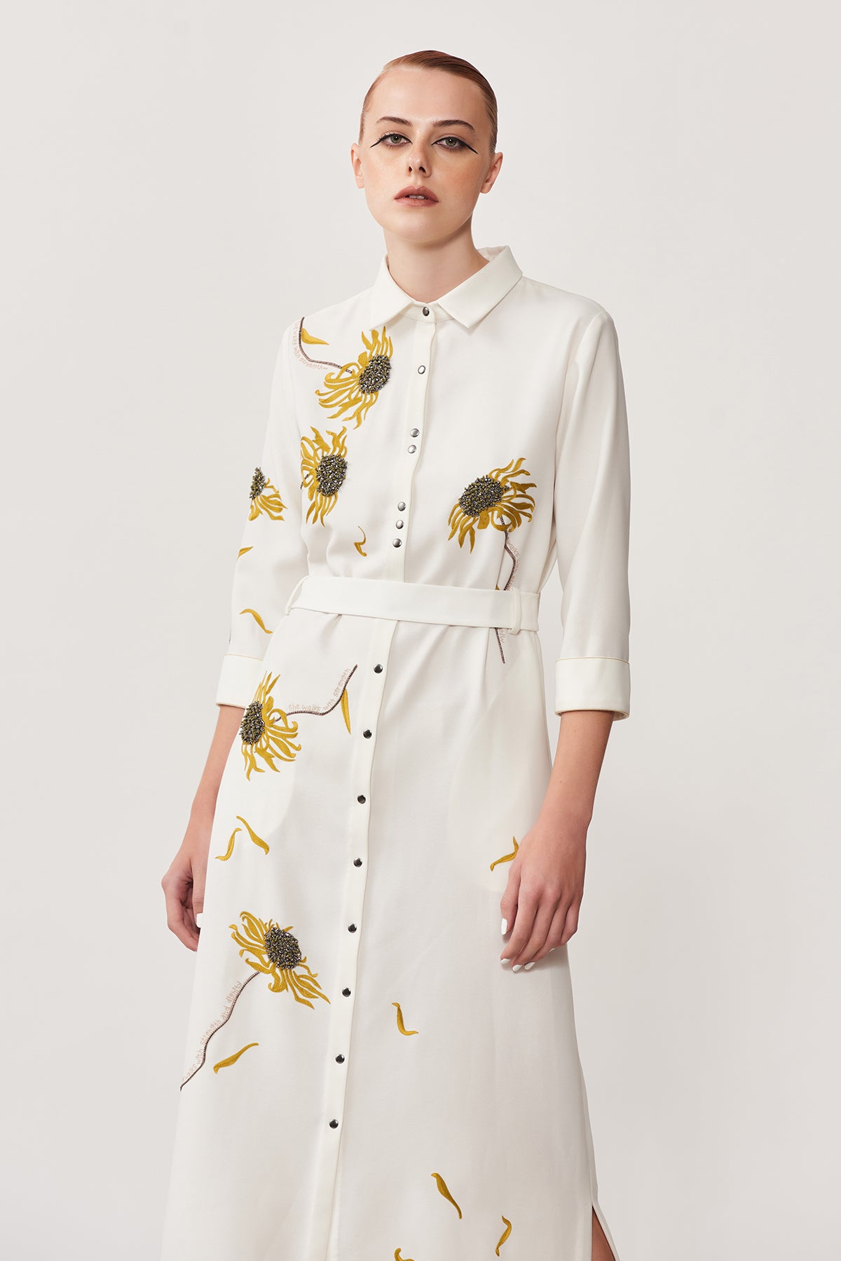 Long Shirt Dress With Embroidery of Withering Flowers. The Garment Has Collar, Side Pockets, Snap Buttons, Turn Up Sleeves With Top Stitching and Seperate Belt.